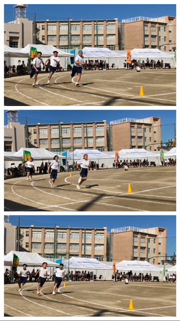 体育大会(6〜9年生)の競技がスタートしました。半周走の様子です。