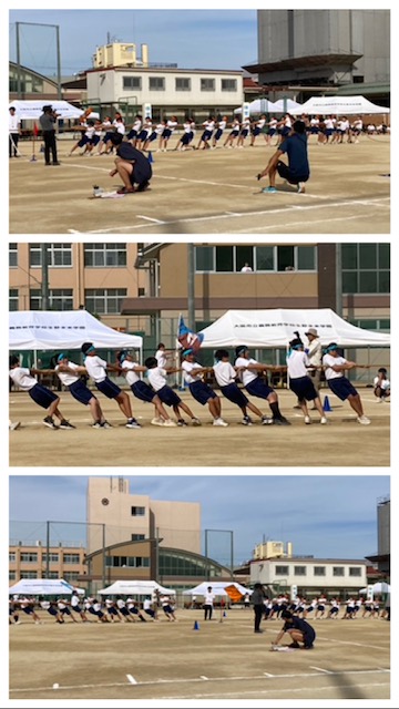 6年生の学年競技は綱引きです。スタートの合図で綱に向かって走り、力いっぱい綱を引きます!