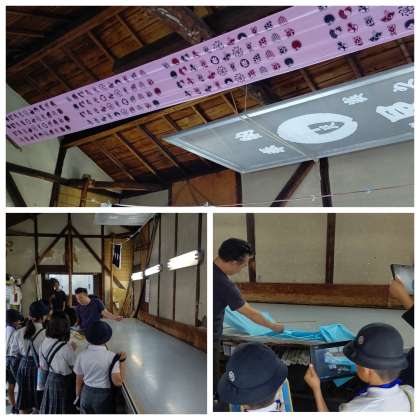 小松染物店では、寺社の幕や祭りの旗などの大きなものから手ぬぐいのような小さなものまで、さまざまな染物が手がけられていました。子どもたちも工程の一部を体験させてもらいましたが、難しい作業を淡々とこなされる姿に職人技のすごさを感じていました。