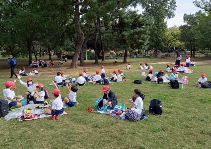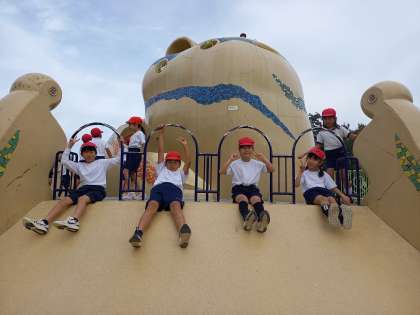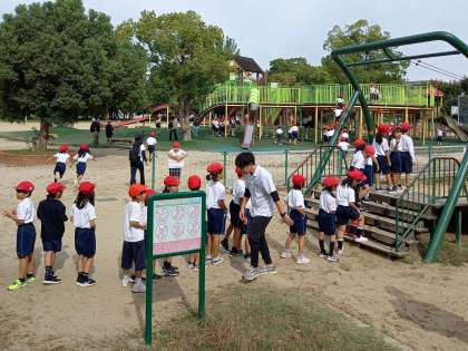10月31日(木)、心配された天気の予報もよそに、遠足日和の晴天の中、2年生は久宝寺緑地公園に行ってきました。予定よりも少し早く出発したことで、天王寺駅から快速電車に乗ることができ、早く到着して目いっぱいに活動することができました。