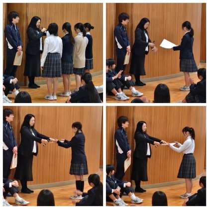 11月11日(月)、6年生〜9年生の全校集会があり、岡准校長先生から次の8人に表彰状が伝達されました。