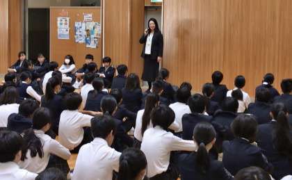 准校長先生からは「7年生が9日、『お店バトル』を行いましたが、お客さんに呼びかけたり商品の説明をしたり、みんながどうすれば売れるかを工夫して頑張っていました。これには6年生のときのRPG商店街の経験が活かされていると感じました。6年生のRPG商店街は今月27日が本番です。しっかりと取り組んでください」「先日、東館で各学年の数学の授業を見ましたが、ちょうど6年生でも7年生でも一次関数のグラフの学習をしていました。6年生で学習したことが7年生でも生かされて更に高度なものとなります。行事も学習も、今習ったことが次の学年、さらに次の学年と生かされて行きます。学びは未来に羽ばたく翼(つばさ)となる。日々の学習に真剣に取り組みましょう」とのお話がありました。