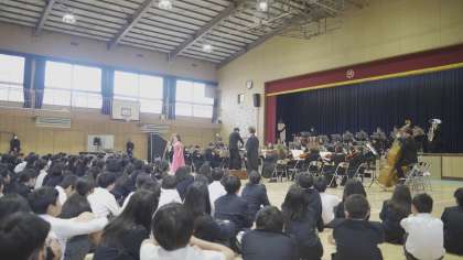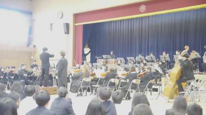 12月12日(木)5,6限に芸術鑑賞会「本公演」が体育館で開催されました。今回は大阪音楽大学が管理運営する「ザ・カレッジオペラハウス管弦楽団」の約70名のフルオーケストラのメンバーで名曲を中心に素敵な演奏を聴かせていただきました。この事業は文化庁「文化芸術による子供の総合育成事業」として行われる学校巡回公演で厳正な審査のもと採択されます。幸い未来学園として開校してから沖縄ミュージカル、クラシックバレエ、そして今回のオーケストラと毎年採択されて質の高い公演を鑑賞できることは子どもたちの情操教育にも多大な良い効果を生み出しています。