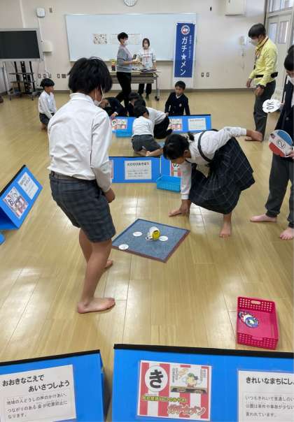 来年2月2日開催予定の生野区長杯ガチメン大会に出場する児童らが12月18日(水)、西館多目的室で区役所の担当職員の指導を受けながら、めんこの練習をしました。
