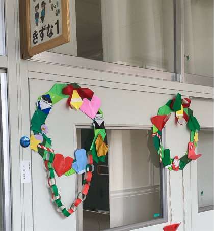作ったのは3年生4人。緑色と黄緑色の折り紙を台形に折り、これらを交互に重ねて輪を作ったあと、やはり折り紙で作ったベルやサンタ、スティック(つえ)などを配置してカラフルでかわいいクリスマスリースに仕上げました。終業式の行われる今月24日(クリスマスイブ)まで飾られます。
