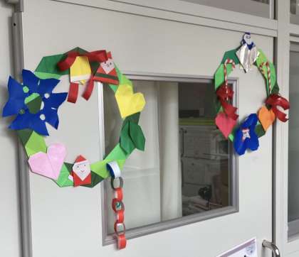 折り紙で作ったクリスマスリース4点がこのほど、中央館2階きずな学級1のドアに飾られました。