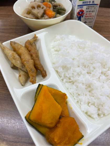 この日の給食には、南瓜を使った「焼きかぼちゃの甘みつかけ」と、ニンジン、レンコン、ダイコン、サンドマメという「ん」のつく食材を4種も使った「含め煮」が登場。また主菜の「きびなごてんぷら」は食材にではなく、献立名に「ん」がついていました。この給食をいただいたことで運気が上がるといいですね。