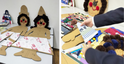 昔着ていた子ども服を小さくて切って、段ボールに貼り付けたり、毛糸に引っ掛けて編み込みをするなどして、作品を作っていきます。