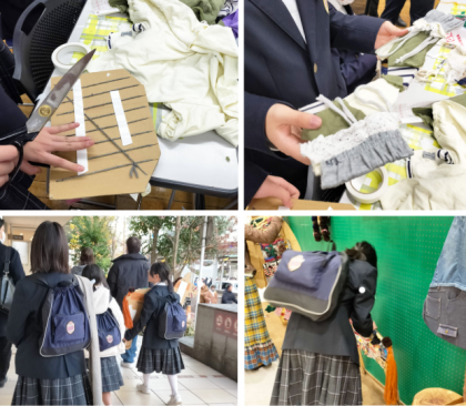 はじめに古着から考える環境についての講話があり、その後、他校の生徒たちと一緒にワークショップを行いました。
