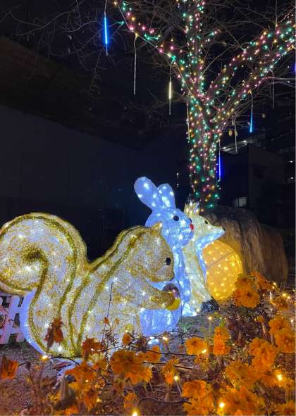 東館前の花壇では、かわいい動物型イルミネーションなどが毎夜点灯し、見る人を楽しませています。