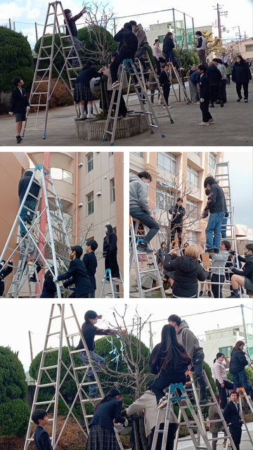 寒空の中、多くの先生方の力をお借りして、「未来クル」第二弾、西講堂前の樹木にイルミネーションが設置されました。