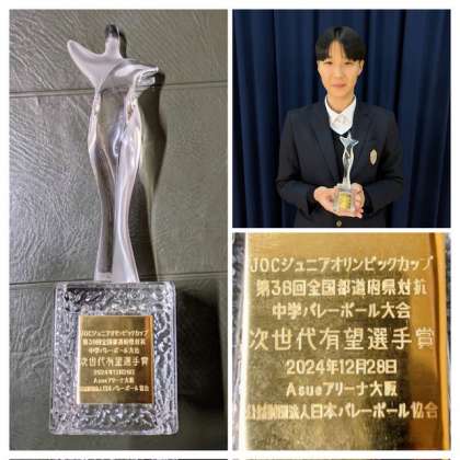 JOCジュニアオリンピックカップで「次世代有望選手賞」を受賞し、始業式で表彰された9年生の西村里音さんが、全国中学生バレーボール日本代表チームの選手に選ばれ、国際交流試合(イタリア遠征)に参加することが決定しました。おめでとう!