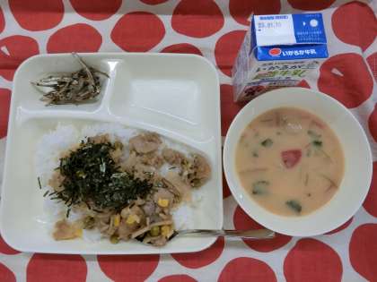 1月10日の給食は正月の行事献立で、「れんこんのちらしずし、ぞう煮、ごまめ、牛乳」でした。ぞう煮には、金時にんじんやさといも、白玉だんごなどが入り、いつものみそ汁より白みその割合が多く、体が温まる一品です。