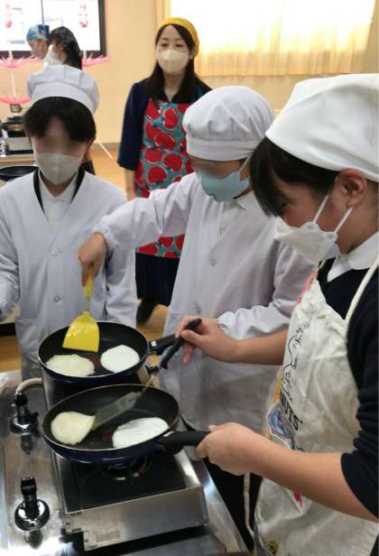 6年生が1月23日(木)、家庭科の調理実習としてクラスごとに米粉のパンケーキ作りをしました。