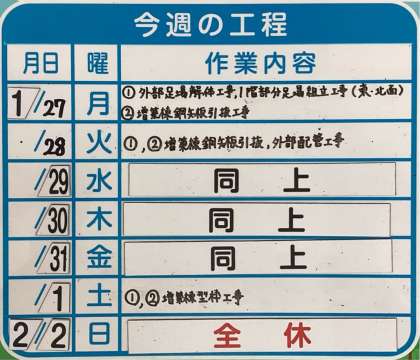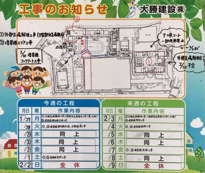 本校における今週(1月27日〜2月2日)の工事予定は「工事のお知らせ」=写真=のとおりです。