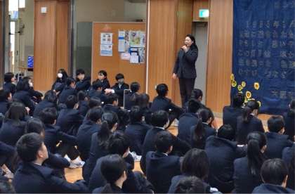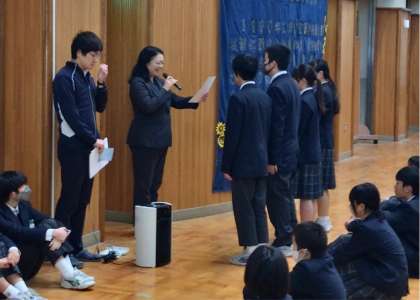 准校長先生からは「昨日は節分でしたが、今日は立春。暦の上では春になりましたね」「先週金曜、8年生たちはスピーチコンテストですごく立派な発表をしてくれました。興味のあるニュースを選んで自分の意見を述べるというものですが、暗記の知識だけではなく、時事問題について調べ、自分の意見をまとめて相手にわかりやすく発表する力はとても大事です。9年生でも公立高校入試に向け、中学時代にがんばったことや高校に入ってからやりたいことなどを自己申告書に書いていますが、ここでもやはり自分の考えを文字にして伝える能力が求められます。日ごろから磨いていきましょう」とのお話がありました。