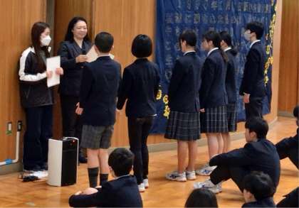 2月3日(月)、6年生〜9年生の学年集会があり、岡准校長先生から次の4人の生徒と6クラスに表彰状が伝達されました。