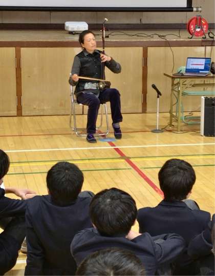 ?8年生が1月30日(木)、東体育館で二胡などの中国楽器の演奏を鑑賞するなどして中国文化に親しみました。