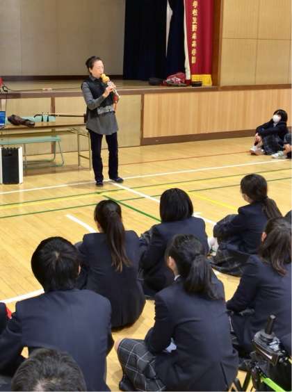 国際理解教育の一環。まず本校国際クラブで活動する中国出身の8年生3人が「中国で幸運とされる色は」(答えは赤)など10問のクイズを出して会場を盛り上げたあと、同クラブで「老師」と呼ばれる中国楽器演奏家の蔡愛琴さんが弦楽器の二胡と、ヒョウタンに竹の管を取り付けた管楽器のフルスを使って「もののけ姫」など生徒にもなじみの曲を中心に演奏を披露しました。子どもたちは中国出身の3人を除いて両楽器の演奏を聴くのは初めて。それぞれの独特な音色にじっと耳を傾けていました。
