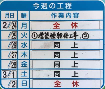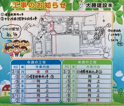 本校における今週(2月24日〜3月2日)の工事予定は「工事のお知らせ」=写真=のとおりです。