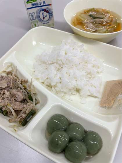 この日の給食では、豚肉と野菜のいためもの、五目汁、ごはん、牛乳とともに提供され、きな粉をかけていただきました。春らしい香りが味わえました。