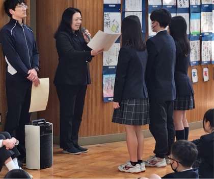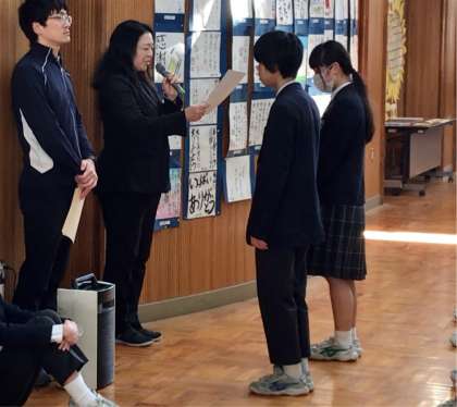 3月10日(月)、6年生〜9年生の全校集会で次の生徒2人と1チームに岡准校長先生から表彰状が伝達されました。