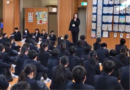 准校長先生からは「いよいよ9年生の公立高校入試の一般選抜が明後日の12日、そして卒業式が4日後の14日ですね」「義務教育学校である本校は、1年生から9年生までが縦割りでさまざまな活動をするのが特長。このことは、テストのように点数には表せませんが、確実にみんなの力となっています」「先週の全校集会で、9年生女子バレーボール部員の欧州遠征の話をした際、各国の監督などから絶賛された日本チームの振る舞いやマナーを、みんなにも実践してほしいとお願いしましたが、そのあと私に笑顔でこんにちはとあいさつしてくれる子が増えてきました。とてもうれしいです」との話がありました。