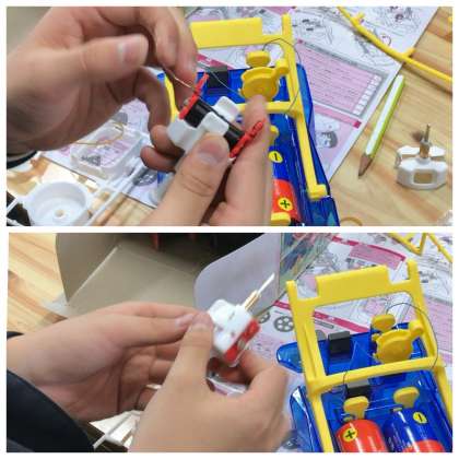 子どもたちは過去7回の授業を通じ、エナメル線をプラスチック芯に100回巻いて電磁石を作り電池につないで磁力が発生するのを確かめるなどして電流の働きやモーターが回る仕組みを学んできました。この日、5年2組の教室では、子どもたちがカバーをつけて回転軸にした電磁石と永久磁石を、模型の車体に取り付けてモーターを作る作業に取り組み、単1電池2本をビニール線でつないで回転するのを確認。続いてタイヤになる部品を取り付け、モーターの力を後輪に伝える輪ゴムをセットして完成させました。
