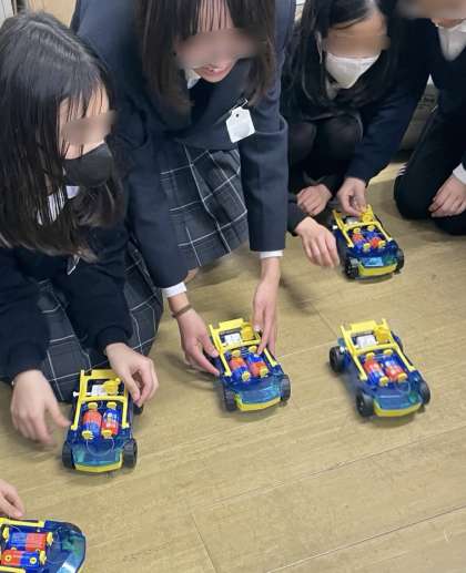 スイッチを入れると車輪が勢いよく回り、子どもたちは大喜び。さっそく模型を教室の床に置いて走らせ、友だちのと競争させていました。1、3組でもこの日、同じ授業に取り組み、動く自動車模型を完成させました。