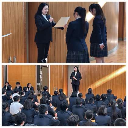 准校長先生からは「9年生が先週、卒業してこの学校を巣立って行きましたので、8年生の君たちが最上級生。4月からは9年生として新1年生から8年生までを引っ張っていくリーダーとなります。今週からその気持ちで行動してほしい。6年生は明日、前期課程修了証書授与式です。4月からは7年生となって後期課程に進みます。新しい目標を立てて進んで行ってほしい」とのお話がありました。