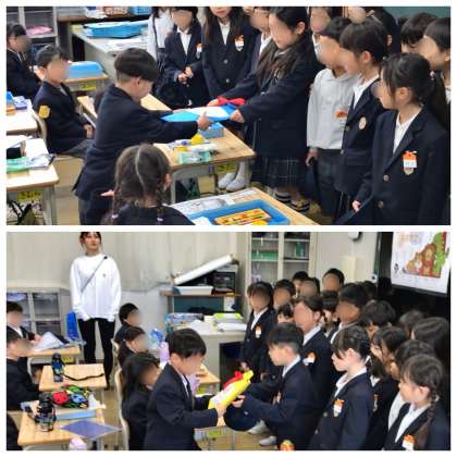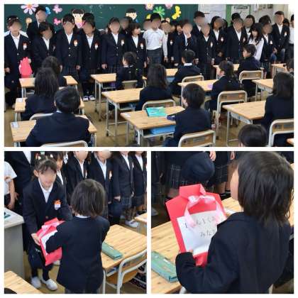 アサガオの種は、色画用紙で作りリボンをつけた大きな袋に入れて準備。3班に分かれて1年生の3クラスを訪れ、代表の子が「大切に育ててくれるとうれしいです」と言って各クラスの代表の子に手渡しました。種は人数分が小分けにされており、1年生はこれを自宅に持ち帰って活用することにしています。