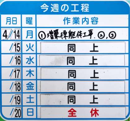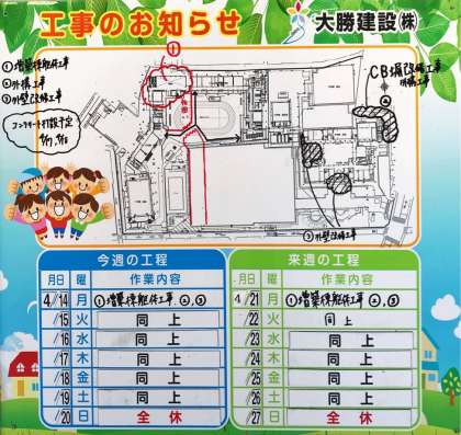 本校における今週(4月14日〜20日)の工事予定は「工事のお知らせ」=写真=のとおりです。
