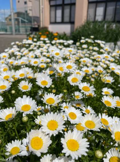 東館前の花壇では今、さまざまな春の花が咲き誇っています。小ぶりながら白い花が密集して咲き、かわいらしい印象を受けるのは、カンシロギク(ノースポール)。北アフリカ、南ヨーロッパ原産のキク科植物です。密集して咲く花と言えば、シバザクラ(芝桜)も色鮮やかで目を引きます。北米原産のハナシノブ科植物で、桜に似た形のうす紫色の花が地面を覆うようにして咲いています。登下校の時などに見て楽しんでください。