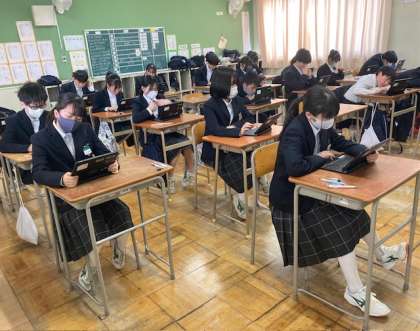 4月14日(月)、全国学力・学習状況調査が始まり、今年度は中学校理科でオンラインを通じて出題・解答するCBT方式のテストが初めて導入され、9年生も学習者用端末を使って取り組みました。