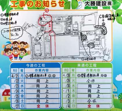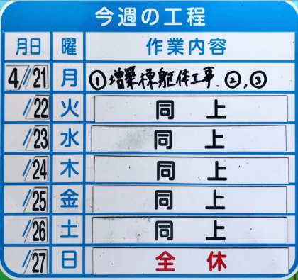 本校における今週(4月21日〜27日)の工事予定は「工事のお知らせ」=写真=のとおりです。