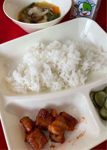 この日の給食では、これに豚肉と野菜の煮物、キュウリの甘酢づけ、ごはん、牛乳がつきました。白ごはんにもよく合い、おいしくいただけました。