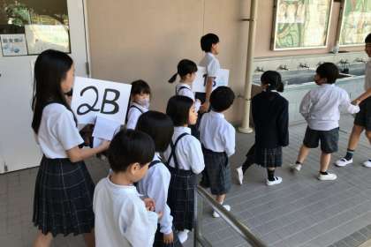 この日午前8時45分、放送を合図にリーダー役の5年生30人が1年生を教室まで迎えに行き、 あらかじめ決められた15の教室まで誘導=上写真。続いてリーダー以外の5年生と2年生〜4年生が各自その15教室に移動し、各教室A・B2班、計30のたてわり班が編成されました。