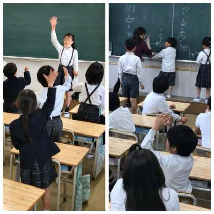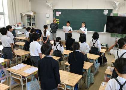各教室では、A班のリーダーとB班のリーダーの5年生が音頭を取って全員が自己紹介。名前に続いて「好きなキャラクターはミャクミャクです」などと自分の好きなものを言い合い、自分の班の顔ぶれを確かめ合いました=中写真。このあと全員で王様じゃんけんや絵しりとりなどのゲームをして楽しみました=下写真。