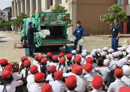4年生がパッカー車(ごみ収集車)を間近に見ながら、ごみに関する出前授業を受けました。