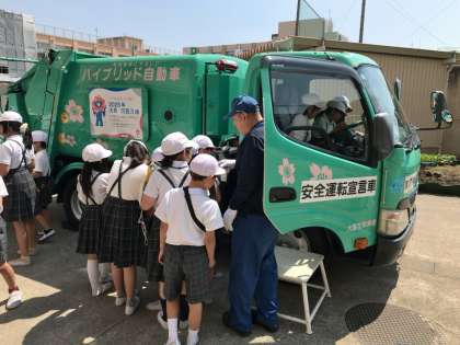 講 師は、区内のごみ収集を担当する東部環境事業センターの職員さんたち。この日は西講堂脇にパッカー車を乗り入れ、ごみを投入して奥に押し込む様子などを子どもたちに披露。普通ごみを収集するとき、スピーカーから流れるのは「小鳥の来る街」という曲であることを紹介したあと、「スピーカーは車体のどこにあるか」「大阪・関西万博の公式キャラクター、ミャクミャクは車体のどこに描かれているか」など6個の課題を出して子どもたちに調べさせました。子どもたちはその間、パッカー車への試乗も体験しました。