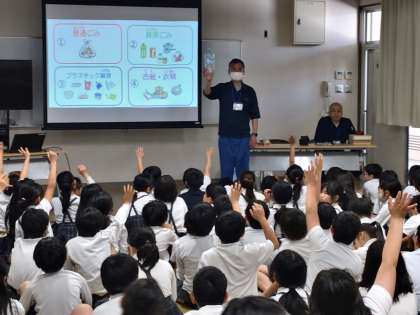 続く多目的室での授業では、循環型社会に向けた「3R」の取り組みについて学習。「ペットボトルは、本体を資源ごみで出し、キャップとラベルをプラスチックごみとして出す」「レシートなどの感熱紙や石けんの箱など匂いの強い紙は普通ごみで出す」などと分別の方法を詳しく教わったほか、「日本で捨てられている食品の量は年間何トンか」「トイレットパーパー1個は牛乳パック何枚で作れるか」といったクイズを通して環境を守る取り組みの大切さを楽しく学びました。最後に「ごみ減量・3Rマイスター」の認定証を全クラスにいただきました。
