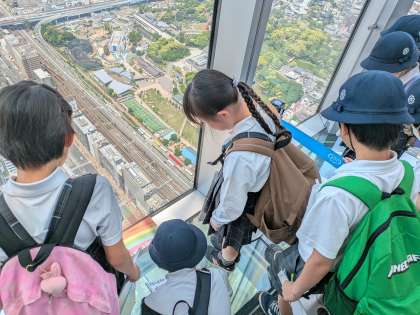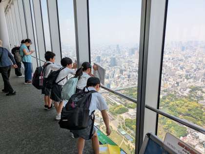 また、天王寺駅で降りた後、あべのハルカスに上り、300mの高さからどんなものが見えるのかをみんなで見つけました。
