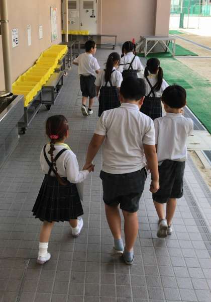 この日、3人〜4人のグループに分かれた1年生は、各教室に迎えに来た2年生に手を引かれて探検に出発。施設を訪れる度に2年生からどんな施設かの説明を受けたあと、クイズを解いてシールをもらい、次の施設に向かっていました。