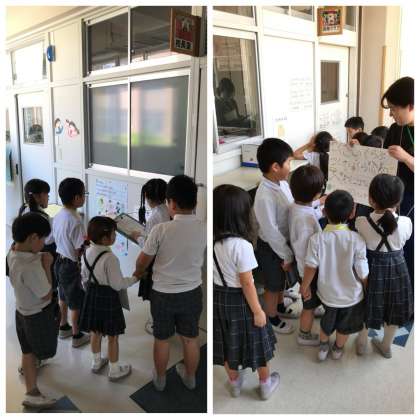 本校は、隣接していた旧西生野小学校と旧生野中学校の校舎を一体的に使用しており、1年生にはとても広くて複雑です。2年生たちは、この日のために中央館の職員室や保健室、西館の図書室や講堂、後期課程の教室がある東館の保健室、管理作業員室など計13施設を探検先に選び、各施設を説明する張り紙を作ったり、それに関するクイズを考えたりして準備していました。