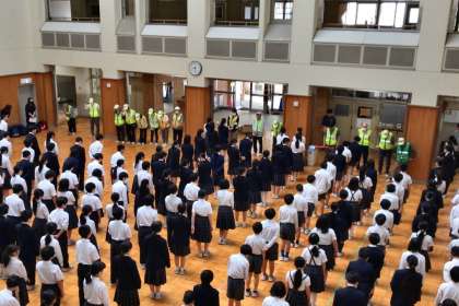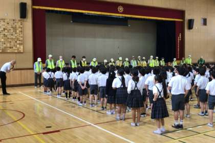 本校の児童生徒が安全に登下校できるよう100人以上の見守り隊のみなさんに日々活動いただいていますが、5月19日(月)あさ、東館ホールでの6年生〜9年生の全校集会にその一部の方々をお招きし、児童・生徒と職員が感謝の気持ちを伝えました。