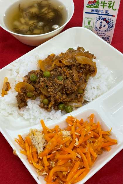 この日の献立「にんじんしりしり風」は、卵の代わりにトリのささみを使い、かつおぶしとみりん、しょうゆで味付けされていました。給食ではこれにタコライスと「とうふともずくのとろり汁」が付きました。おいしくいただきました。