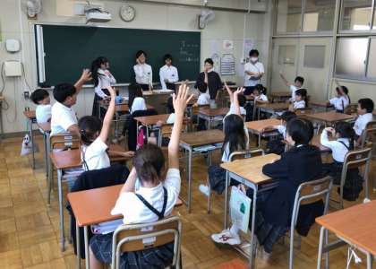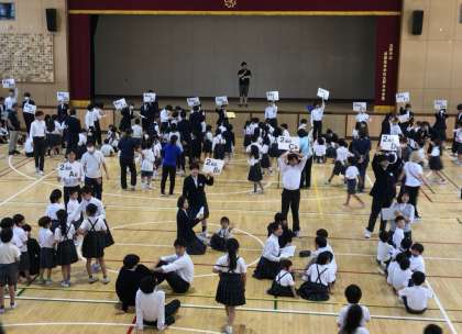地区別班は4地区計22班。この日5時間目、9年生が東体育館に集まり、自分の班の名前が書かれた大きなカードを頭上に掲げながら、教員に引率されて来た1・2年生のメンバーを各班に迎えました。続いて、その子たちを連れ各班に割り当てられた教室や多目的室などの集合場所に移動。各集合場所には3年生〜8年生も順次集まり、全員がそろうと、みんなで自己紹介し合ったりゲームをしたりして顔ぶれを確認しました。