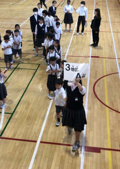 大きな地震や台風などの緊急時に子どもたちが迅速に帰宅できるようにするため、全児童生徒が6月4日(水)、指定された地区別班ごとに集合する訓練をしました。