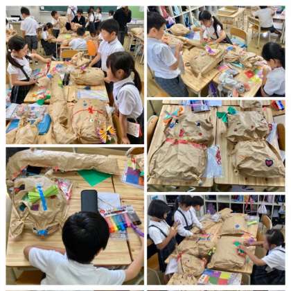 2年生の図工の授業の様子です。「新聞紙と仲良し!」と新聞紙に親しんだ2年生が、今度は丈夫で大きな紙袋の中に新聞紙を詰めて、ギュッとできるおともだちを作っています。
