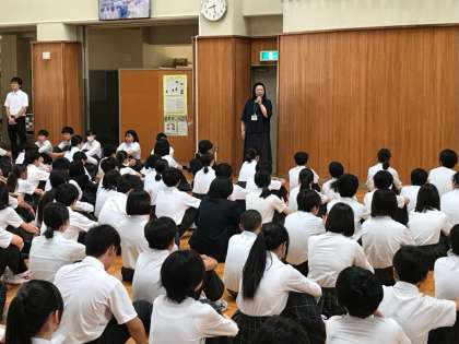 また、社会で働く人たちは仕事や人間関係がうまくいかないで悩むことも多く、どうすれば解決できるかを自分に問い、その方法を学んで実行しています。人生はその繰り返しです。みんなも学校で多くの友だちと一緒に学んでいます。授業で一方的に教わるだけでなく、疑問を持ったり、より深く知りたいと思ったりしたことについては自ら進んで調べてみましょう。人とのよりよい関係づくりなどについても考えてみましょう」とのお話がありました。